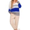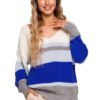 The best accessory to jeans for chilly evenings is a loose-fitting sweater with a v-neck, with a striped motif in face colors.