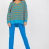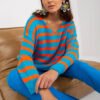 Women’s sweater with colorful stripes, long sleeves and a v-neck.
