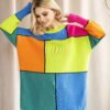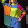 Loose-fitting sweater with long sleeves, tucked in over the head. The back of the sweater slightly extended. Sweater in a pattern of colorful blocks.