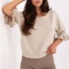 Elegant women’s sweater of standard length, perfect for both everyday wear and more special occasions. Made of high-quality blend of viscose, polyester, and nylon, it ensures comfort and durability. The smooth pattern gives it a timeless character, and subtle details add a feminine charm. The model features a round neckline and 3/4 sleeves finished with a delicate ruffle, which emphasize the elegance and lightness of the outfit. This is an excellent choice for women who appreciate classic style with a modern twist.