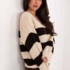 Oversized women’s sweater is the perfect choice for everyday casual stylizations. The loose fit provides full freedom of movement and comfort, while the standard length makes it perfect to pair with both pants and skirts. The model stands out with a dominant striped pattern, adding lightness and a fashionable accent. The long sleeve and V-neck highlight the feminine style, while ensuring comfort and versatility. The sweater is made of a high-quality blend of acrylic, alpaca, wool, and polyester, making it soft, pleasant to the touch, and adequately warm. The model has no fastening, it is put on over the head, emphasizing its casual, oversized character. It is a perfect choice for everyday occasions when you want to look fashionable and feel comfortable at the same time. Ideal for cooler days.