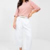 Elegant women’s sweater of standard length, perfect for both everyday wear and more special occasions. Made of high-quality blend of viscose, polyester, and nylon, it ensures comfort and durability. The smooth pattern gives it a timeless character, and subtle details add feminine charm. The model stands out with a round neckline and 3/4 sleeves finished with a delicate ruffle, which emphasize the elegance and lightness of the styling. This is a perfect choice for women who appreciate classic style in a modern edition.