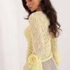 Elegant lace blouse is a stylish proposal that will work perfectly for both special occasions and everyday stylizations. Made of high-quality material combining polyester with elastane, it ensures comfort and a good fit to the silhouette. The varied texture of the material gives the blouse a unique character and subtle elegance. The model with a short length, round neckline, and without fastening looks light and modern. Long bell sleeves are finished with fancy frills and a decorative fabric flower, which attract attention and add a romantic accent to the whole. The front of the blouse has a lining, while the sleeves and back remain delicately transparent, emphasizing the lace character of the model. Additional pleats on the sides of the blouse subtly shape the silhouette. The blouse will work perfectly as a styling element for formal occasions, parties, work, and everyday wear, combined with high-waisted trousers, a skirt, or elegant jeans.