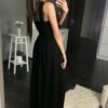 Long ethereal sleeveless dress in black. A neckline trimmed with glittering embellishments. Perfect for many occasions.