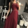Long ethereal sleeveless dress in aubergine color. A neckline trimmed with glittering embellishments. Perfect for many occasions.
