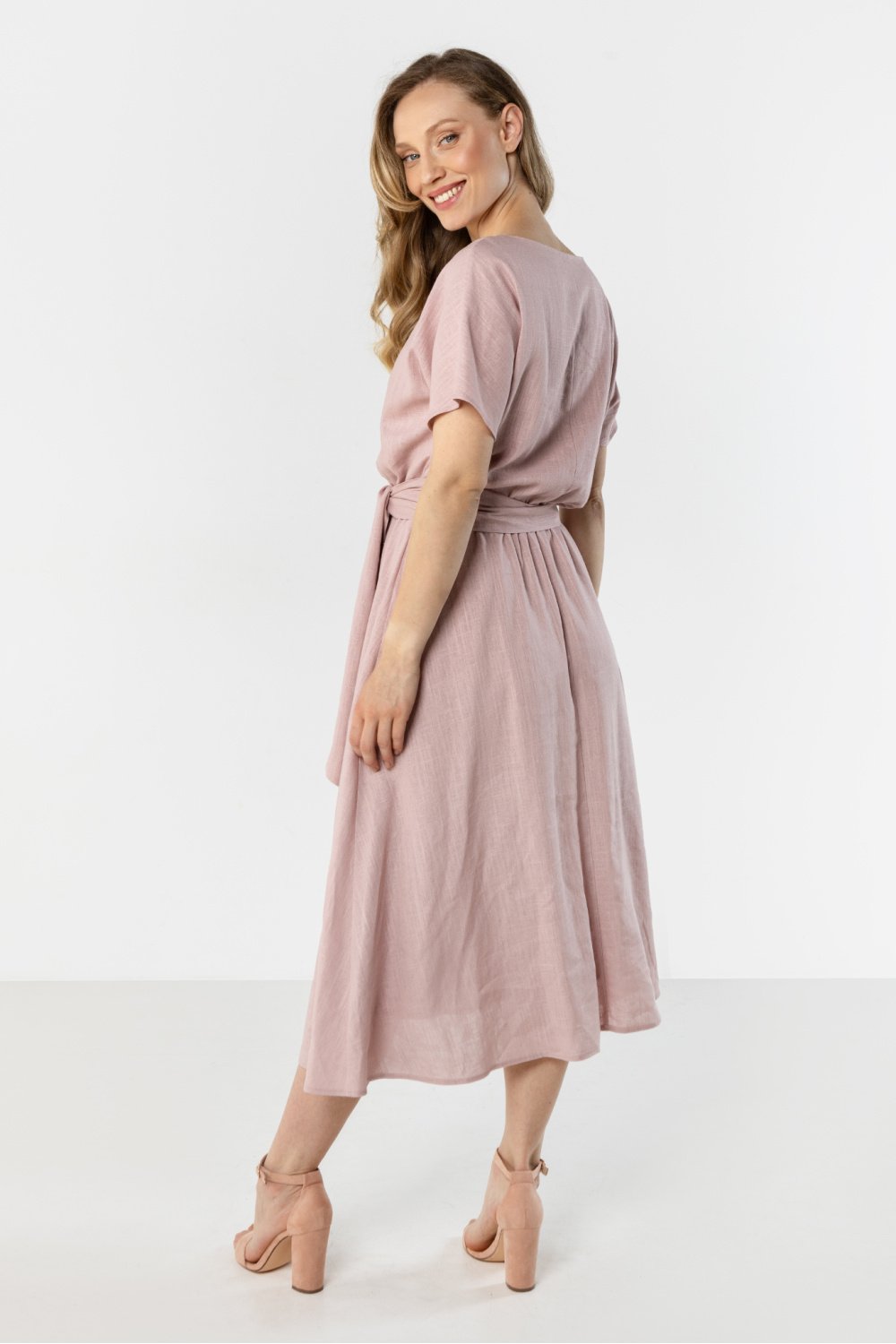 Elegant long dress with a ruffled neckline. On the left side of the bottom of the dress a slit. At the waist a crease with an elastic band to fit the figure. The dress is sewn on an elastic lining. The dress is made in Poland.