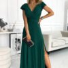 Long glitter maxi dress with envelope neckline and leg slit. The dress comes in a bottle green color with glitter. The dress beautifully exposes the neckline and fits perfectly for dancing. Fastened at the back with a covered zipper. Polish product. Brand numoco.