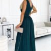 Long brocade maxi dress with deep neckline, wide straps and leg slit. The dress comes in bottle green color with brocade. The dress beautifully exposes the neckline and fits perfectly for dancing. Fastened at the back with a covered zipper. Polish product. Brand numoco.
