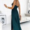 Long brocade maxi dress with neckline, double straps and leg slit. The dress is bottle green in color with brocade. The dress beautifully exposes the neckline and fits perfectly for dancing. Fastened at the back with a covered zipper. Polish product. Brand numoco.