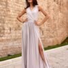 Brocade maxi dress with a tie at the back is an excellent choice among our evening dresses. The dress is stunning because of the small glittering particles in the fabric. It will shimmer beautifully in the sunlight or spotlight with all kinds of colors. The brocade maxi dress with a tie at the back is produced from a beautiful shimmering fabric that will give us a dazzling look. The dress features an envelope neckline and a leg slit, which adds sensuality. The dress features a decorative binding on the back. It fastens with a covered zipper. The evening dress looks especially good on women who like to shine and feel like a real star. The long dress will be ideal for all kinds of celebrations, such as wedding, communion, corporate events. The product is made and sewn in Poland.