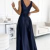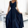 Long satin maxi dress with neckline and bow. Made of pleasant to the touch, shiny fabric in a fashionable navy blue color. Fastened at the back with a covered zipper. Polish product. Brand numoco.