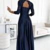 Elegant long lace maxi satin gown with neckline. Beautifully shaped neckline, slit on the skirt and shiny satin create an unusual creation in navy blue. Polish production. Numoco brand.