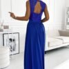 Blue long maxi dress with lace neckline and open back. The dress beautifully exposes the neckline. Ideal for New Year’s Eve, Carnival, proms, weddings or other major events. Polish product. Brand numoco.
