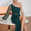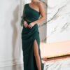 Model with a beautiful sequin one-shoulder sleeve. The top is asymmetrical, also with a sequin insert. The bottom of the creation is smooth, crinkled, with a striking slit on the leg. The dress is fastened with a covered zipper and has a lining. The dress is extremely elegant, stylish ideal for balls, proms and weddings.
