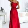 Elegant maxi long satin dress with leg slit and belt. Beautifully shaped neckline and slit on the skirt creates an unusual composition. Made of shiny, smooth, slightly stretchy satin in red. The dress is ideal for weddings, New Year’s Eve, proms, carnivals and other more important outings. Polish production. Numoco brand.