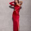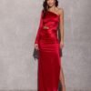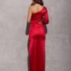 The dress is made of delicate satin fabric, which gracefully wraps the silhouette emphasizing the shapes. An original neckline with one long sleeve and a sexy cutout on the waist add a unique look. Fastening at the back with a covered zipper ensures a perfect fit to the silhouette. The maxi length and leg slit make the Edith dress an exceptional choice for elegant celebrations, which will make you feel extremely feminine and sensual. Edith dress beautifully exposes and emphasizes the qualities of the silhouette making you feel extremely feminine and special at important events such as: prom, wedding, communion, corporate event.