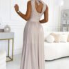 Justine maxi long gown with neckline, leg slit and back tie. Made of stretch fabric. Dress in beige color with brocade. Fastened at the back with a covered zipper. Polish product. Brand numoco.