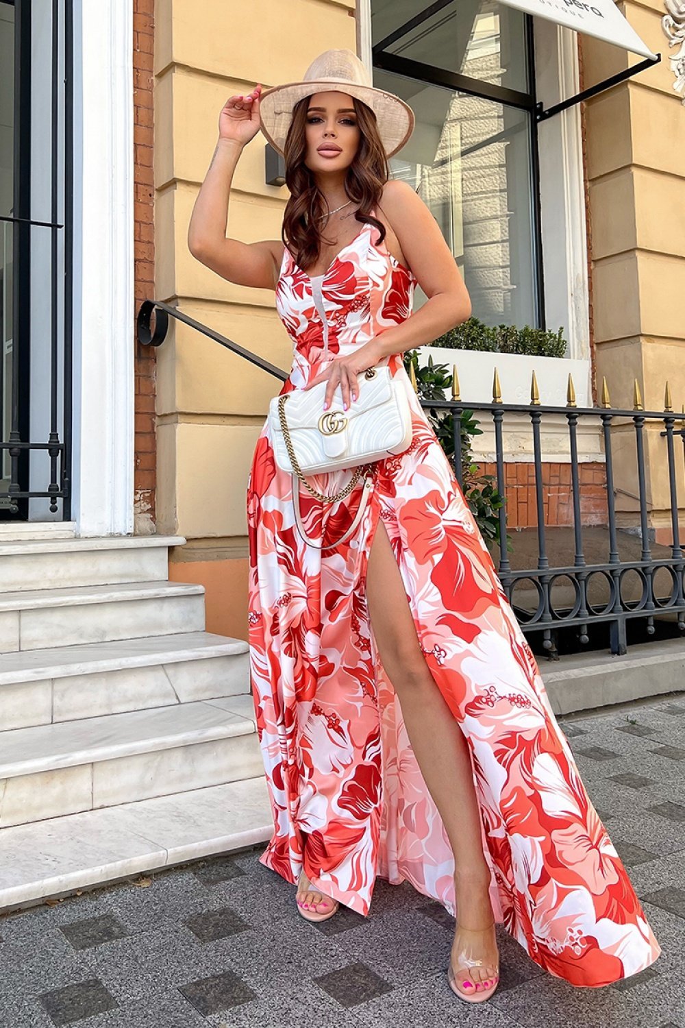 Beautiful, long dress that amazes with its unique cut. Made of airy fabric, it perfectly emphasizes the silhouette. The top of the dress has a delicate neckline, and the two-layer bottom with a leg cut adds charm to the creation. The dress comes with a rose belt that can be wrapped in many ways, both around the neck and waist, allowing for individual adjustment of the styling.