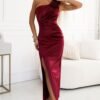 A satin long one-shoulder gown decorated with beautiful roses, which add a unique touch to the creation. The dress has a leg slit and draping at the waist and bust, which emphasize the silhouette and add elegance. Made of high-quality satin fabric in a deep burgundy color. Perfect for formal occasions. Polish product.