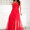 Elegant dress with a stiffened top, covered zipper, and shimmering sequins. Flowing bottom with mesh and a striking slit adds sensuality. The dress is fastened with a covered zipper. Perfect for weddings, balls, and special occasions.