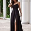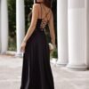 Elegant, yet simple long dress with a slit at the bottom. The dress fastens with a hidden zipper. The front features a water neckline with thin straps, while the back has a woven tie. An ideal choice for many occasions.