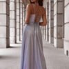 Elegant, yet simple long dress with a slit at the bottom, made of shiny material. The dress fastens with a concealed zipper. The front has a water neckline with thin straps, the back has a braided tie. An ideal proposition for many occasions.