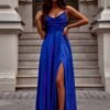 Elegant and at the same time simple long dress with a slit at the bottom, made of shiny material. The dress fastens with a concealed zipper. The front has a water neckline with thin straps, the back has a braided tie. An ideal proposition for many occasions.