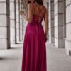 Elegant and simple long dress with a slit at the bottom, made of shiny material. The dress fastens with a hidden zipper. The front has a water neckline with thin straps, and the back has a woven tie. An ideal proposal for many occasions.