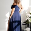 Elegant long dress with a wrap neckline, thin straps, and sleeves. The dress is cut at the waist, fastened with a concealed zipper, flared bottom with a slit. The dress is made of flowing smooth fabric.