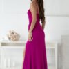 Long dress with a fitted cut, adjustable straps, fastened with a covered zipper. Deep neckline, bottom with a long slit. An ideal proposal for many occasions.