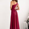 Long straight dress with asymmetrical straps, one thin, the other thicker. Dress cut at the waist, flared bottom. Dress fastened with a hidden zipper on the side. Decorative slit with a braided tie on the back.