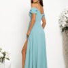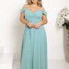 Elegant long dress with a wrap neckline, thin straps, and sleeves. The dress is cinched at the waist, fastened with a hidden zipper, flared bottom with a slit. Made of flowing smooth fabric.