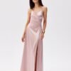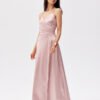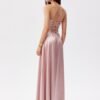Maxi dress with thin straps. The top is wrap-around, and the bottom is slightly flared with a slit for the leg. It does not have a lining, has decorative lacing on the back, which allows for a perfect fit to the silhouette.