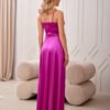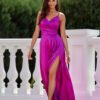 The long Salma dress made of soft satin fabric guarantees an elegant and dignified look and exceptional comfort when worn. The gathered wrap neckline perfectly emphasizes the feminine shapes and adds nonchalance. Thin straps, classically connected to the back of the dress, provide good support and exceptional comfort, seductively revealing the shoulders. Fastened with a concealed zipper at the back. The subtly flared cut of the dress has been enriched with a sexy slit on the leg, adding a touch of fierceness. The Salma dress is a versatile and classic style that will work for all types of occasions, such as prom, weddings, corporate events, and New Year’s Eve.