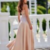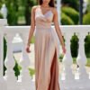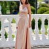 The long Salma dress made of soft satin fabric guarantees an elegant and dignified look as well as extraordinary comfort. The pleated wrap neckline perfectly emphasizes feminine shapes and adds nonchalance. Thin straps, classically combined with the back of the dress, provide good support and exceptional comfort, seductively revealing the shoulders. Fastened at the back with a concealed zipper. The subtly flared cut of the dress has been enriched with a sexy slit at the leg, adding a touch of fierceness. The Salma dress is a versatile and classic dress style that will be perfect for all types of occasions, such as prom, weddings, corporate events, and New Year’s Eve.
