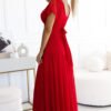 The dazzling red maxi dress is the quintessence of femininity and self-confidence. Its intense color attracts attention, while the light, flexible mesh delicately envelops the silhouette, providing freedom of movement and comfort throughout the evening. At the front, it delights with a wrap neckline that emphasizes the bust and adds a hint of sensuality to the outfit. The short, transparent mesh sleeves give the dress lightness, and the wide ruched waistband beautifully shapes the silhouette. At the back, the dress looks equally stunning, with a V-neckline and a waist tie allowing for a perfect fit to the figure. The slightly flared bottom elegantly ripples with each step, creating a unique visual effect. This is the perfect proposal for women who want to shine.