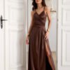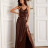 The long Salma dress made of soft, satin fabric combines elegance, style, and comfort. The gathered wrap neckline beautifully accentuates feminine shapes, giving the styling a bit of freedom and lightness. Thin straps classicly connect with the back, providing stability and comfort, while sensually revealing the shoulders. The dress is fastened at the back with a discreet zipper. The subtly flared bottom is embellished with a striking slit on the leg, adding character to the whole. Salma is a timeless model, perfect for various occasions from prom, through weddings and corporate events, to a New Year’s Eve night.