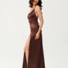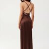 The long Alessandra strappy dress is made of elegant, satin fabric that softly flows around the silhouette, emphasizing its attributes. The draped neckline combined with a striking tie at the back gives the whole outfit a distinctive yet elegant character. The maxi length paired with a thigh-high slit introduces a hint of sensuality and lightness. The adjustable lacing at the back not only attracts attention but also allows for the length of the straps to be adjusted to individual needs. Alessandra is a proposition for women who appreciate feminine, bold styles and want to stand out in an elegant way. It will work perfectly for special occasions such as prom, weddings, corporate events, or New Year’s Eve.