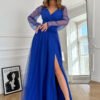Beautiful long dress, extremely elegant, made of flowing fabric. The top with a delicate neckline, the bottom is layered with a slit on the leg, adding charm to the outfit. The dress fastens with a concealed zipper. A belt is included with the dress. Available in trendy colors.
