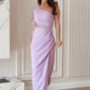 Model with a beautiful sequined one-shoulder sleeve. Asymmetrical top, also with sequin insert. The smooth, pleated bottom of the creation has a striking slit on the leg. The dress is fastened with a hidden zipper and has a lining. The dress is extremely elegant, stylish, perfect for balls, proms, and weddings.