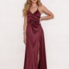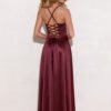 Flowy maxi dress with thin straps, wrap top, subtly flared bottom with a striking slit on the leg. The model is unlined, with decorative lacing on the back, allowing for individual adjustment to the silhouette.