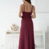 Sensual and elegant maxi dress, fastened at the back with a concealed zipper, which subtly emphasizes the back line. The model has thin straps, exposing the shoulders and neckline, as well as ruches on the front, which add lightness and delicately shape the silhouette. The bottom of the dress has a wrap slit, beautifully highlighting the leg with every step, giving the whole a particularly feminine character. Made of soft, slightly elastic material, it fits perfectly on the body and ensures comfort when wearing. An ideal proposal for evening outings, elegant receptions or romantic dinners.