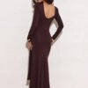 A long dress with long sleeves is a synonym of class and feminine charm in a modern edition. Made of flexible material, it perfectly fits the silhouette, emphasizing its advantages and providing full comfort of wearing. Shoulder pads give the outfit a distinct shape and elegant character, and a decorative sash at the waist beautifully accentuates the waist. The deep neckline at the back of the dress adds sensuality and elegance. Perfect for special occasions, evening parties, and elegant outings.