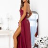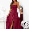 A long dress made of smooth, shiny fabric. A model with detachable straps, with a delicately ruched top and a striking, high slit on the leg. The back is finished with adjustable, corset-like lacing, which perfectly adjusts the dress to the silhouette, an additional concealed zipper on the side. The flared bottom beautifully falls in motion, creating a light, elegant effect. Perfect for prom, New Year’s Eve, and other special occasions.
