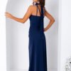 Elegant and sensual evening dress, created for the most special occasions. The model impresses with a refined cut that beautifully accentuates the silhouette and guarantees a spectacular effect for every outing. The long, slightly flared skirt adds lightness to the silhouette and beautifully flows with movement. High, eye-catching slit at the front. The sensual slit reveals the leg, giving the outfit an elegant yet daring character. The upper part of the dress has been subtly draped, masking any imperfections and adding a luxurious finish. The neckline is finished with an elegant stand-up collar, looking extremely chic and elongating the neck line. The dress has a sleeveless cut, beautifully highlighting the arms and adding lightness to the entire look. At the back of the dress, there is an eye-catching, long ribbon tied at the neck to create an elegant bow or loosely hanging, adding a unique character to the outfit. Additionally, the model has thin stabilizing straps. The fabric gently drapes over the body, delicately shines, and is comfortable to wear throughout the evening.