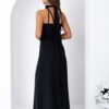 Elegant and sensual evening dress, created with the most special occasions in mind. The model captivates with a refined cut that beautifully emphasizes the silhouette and guarantees a spectacular effect for every outing. The long, slightly flared skirt adds lightness to the figure and beautifully flows with movement. High, eye-catching slit at the front. A sensual slit reveals the leg, giving the outfit an elegant yet daring character. The upper part of the dress has been subtly draped, masking any imperfections and adding a luxurious finish. The neckline finished with an elegant stand-up collar looks extremely chic and elongates the neck line. The dress has a sleeveless cut, which beautifully highlights the shoulders and adds lightness to the entire outfit. At the back of the dress, there is an eye-catching, long ribbon tied at the neck creating an elegant bow or hanging freely, adding a unique character to the outfit. Additionally, the model has thin stabilizing straps. The material softly drapes the body, gently shines, and is comfortable to wear throughout the evening.