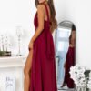 Dress is the quintessence of evening elegance and femininity, created for women who appreciate classic chic and the possibility of personalization. This long dress type enchants with deep, saturated black and an extremely sensual cut. The key feature of the SHARON model is the tied top, which allows for almost unlimited styling options. One evening you can wear it tied at the neck (classic halter), another on one shoulder (asymmetrical look), and yet another with straps crossing at the back. You decide! The bra-like top with delicate ruching subtly shapes the bust and creates a deep V-neckline, which optically elongates the neck. Sensual, high slit on the leg adds a predatory element to the dress, ensures freedom of movement, and beautifully highlights the legs while walking. Fitted at the waist, the loosely flowing A-line skirt lays beautifully in motion, simultaneously masking any imperfections in the hip area. Made of elegant, slightly flowing material (e.g. viscose with a touch of high-quality elastane), which drapes perfectly and does not wrinkle. The SHARON dress is a perfect choice for the most special events.