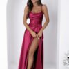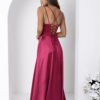 The long dress with thin straps enchants with an elegant, feminine silhouette and well-thought-out details. The flowing neckline softly drapes on the chest, giving the styling lightness and subtle sensuality. The striking slit on the leg accentuates the silhouette and adds distinctive character to the whole. The back of the dress is adorned with decorative lacing, which allows for a perfect fit to the figure and is a unique accent. The model is fastened with a concealed zipper placed on the left side, ensuring comfort and aesthetic finishing. The dress will be perfect for evening outings, receptions, and special occasions.