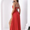 Long dress made of smooth, shiny fabric. Model with detachable straps, with delicately pleated top and an eye-catching, high slit on the leg. The back is finished with an adjustable, corset-style lacing, which perfectly adjusts the dress to the silhouette, additional hidden zipper on the side. The flared bottom beautifully flows with movement, creating a light, elegant effect. Perfect for prom, New Year’s Eve and other special occasions.