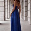 Elegant, yet simple long dress with a slit at the bottom, made of shiny material. The dress fastens with a hidden zipper. The front has a water neckline with thin straps, the back has a braided tie. An ideal proposal for many occasions.